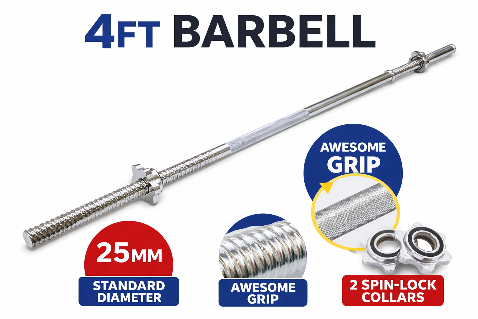 Buy 4ft 25mm Barbell Rod with Star Nut Collars in Nepal – knurled grip, secure locks, fits standard plates. Best price for home gym & strength training in Kathmandu. Fast COD!